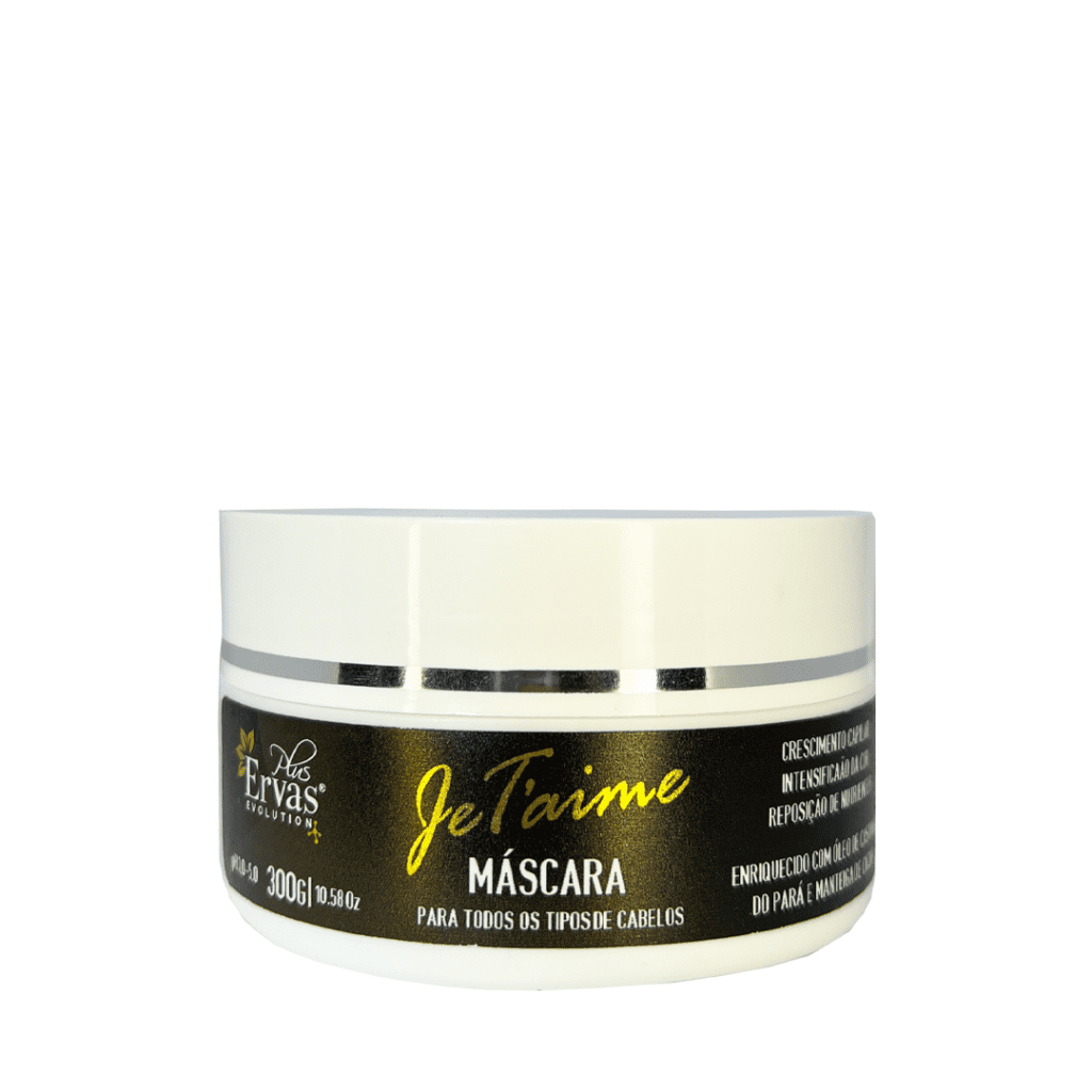 Máscara – 300g com pH 3,0 – 5,0 Formulada para proporcionar sedosidade e brilho incomparáveis, devido à cuidadosa seleção de ativos naturais especialmente escolhidos. A Máscara da Linha Je T’aime visa reduzir a porosidade e controlar o frizz, além de intensificar a cor de cabelos coloridos e aumentar a longevidade dos fios.